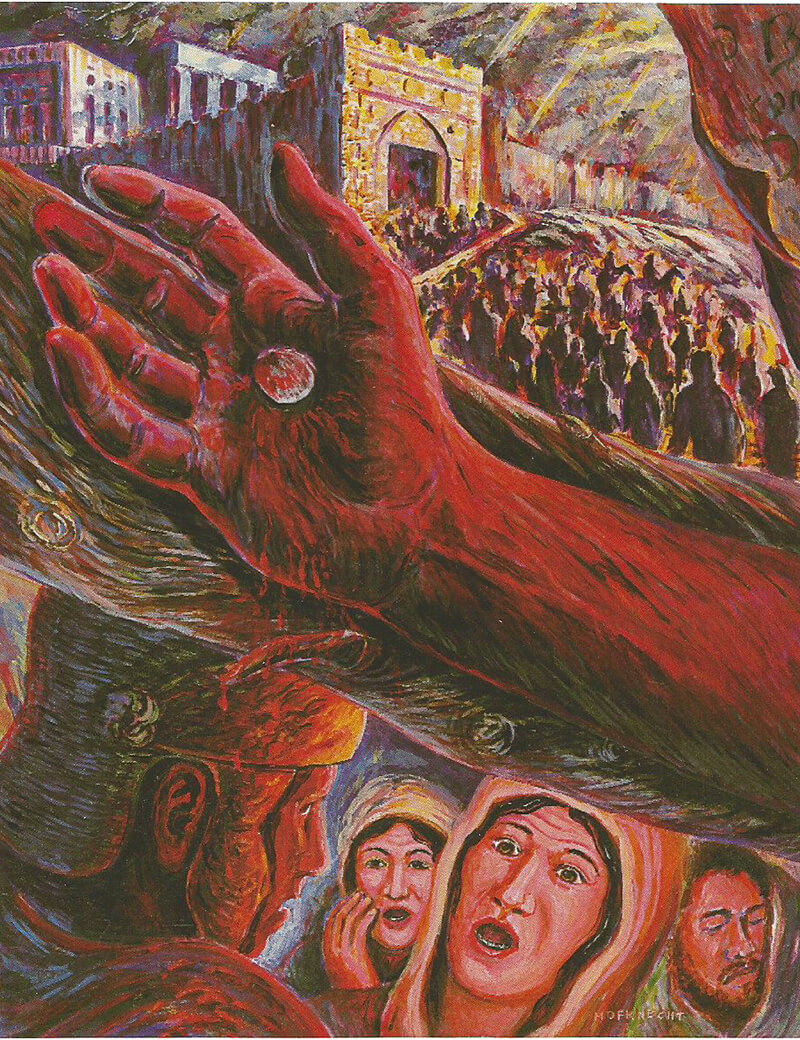The precious blood drips down on the helmet ofthe Roman guard while Jesus' followers look up in grief. That blood turns enemies into friends of God and redeems us for eternal life. Source: Hebrews 13:12